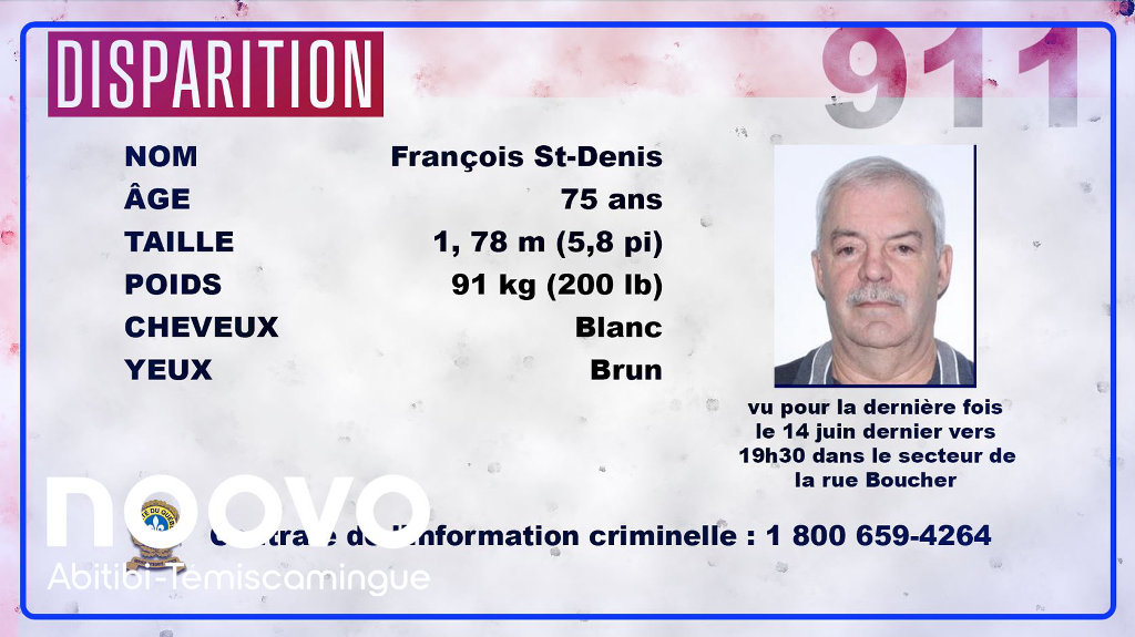 Toute personne ayant vu monsieur St-Denis ou possédant de l’information est invitée à contacter le 911 ou la Centrale de l’information criminelle de la SQ.
