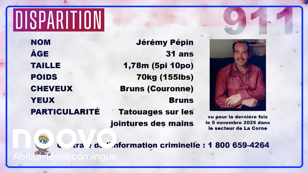 La Sûreté du Québec demande l’aide du public pour retrouver Jérémy Pépin, 31 ans, de La Corne.
