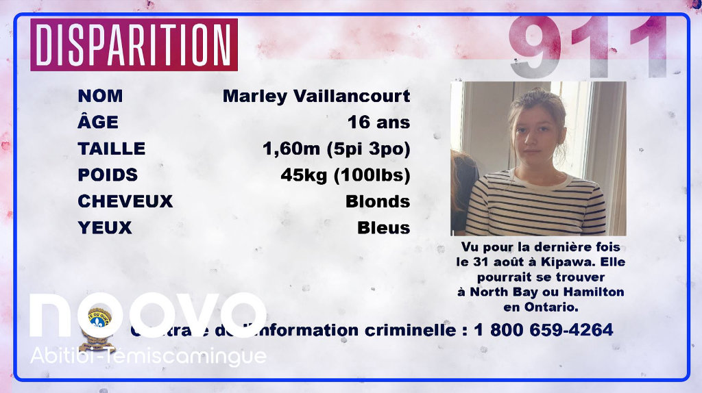 La Sûreté du Québec demande l’aide du public pour retrouver Marley Vaillancourt, une adolescente de 16 ans, de Kipawa.