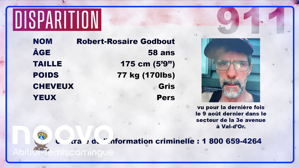 Un homme de 58 ans de Val-d’Or est porté disparu.