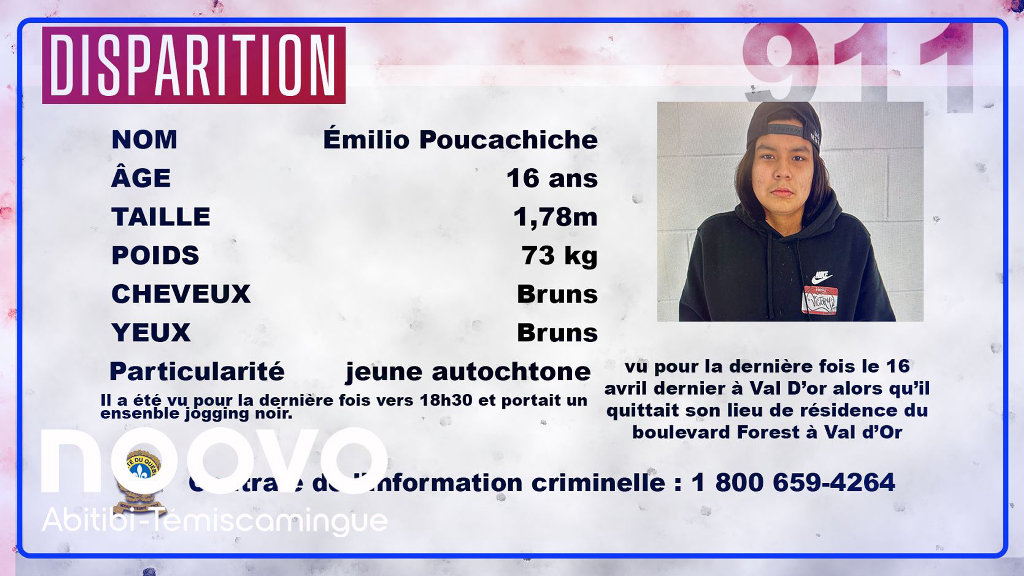 À Val-d’Or, la Sûreté du Québec demande l’aide du public pour retrouver Émilio Poucachiche.